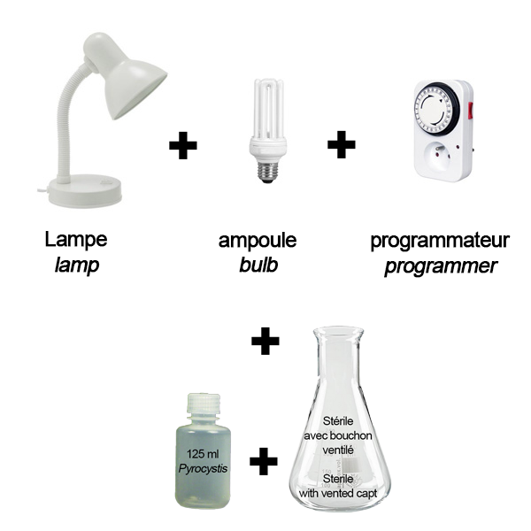 Kit ZoeLab :Ce kit permet de placer la culture de Pyrocystis contenue dans le flacon de transport dans les bonnes conditions de cultures pour une conservation de longue durée. Une notice détaillée, expliquant la méthode de maintien de la culture et de présentation de la bioluminescence. Prix unitaire : 69 Euros* |